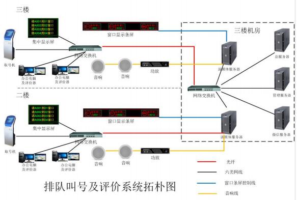 一樓、三樓辦事大廳各設(shè)置為一個(gè)叫號(hào)區(qū)域配套大屏幕電視機(jī)。一樓、三樓區(qū)域安裝取票機(jī) 1 臺(tái),二 樓區(qū)域安裝取票機(jī) 2 臺(tái)。各配套大屏幕電視機(jī)進(jìn)行信息集中顯示,以及音響系統(tǒng)進(jìn)行語(yǔ)音提示。各區(qū)域根