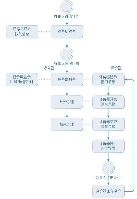 排隊(duì)叫號(hào)及服務(wù)評(píng)價(jià)系統(tǒng)工作流程圖: